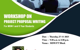 PG DEPARTMENT OF SOCIAL WORK Organizes Workshop on Project Proposal Writing For MSW I and II Year Students Date : Thursday, 27-11-2025 Time : 9:30 a.m. to 3:30 p.m. Venue : MSW/FT Block Resource Person: Ms. Aasika Joseph Learning and Development Coordinator The Association of People with Disability APD- Bangalore