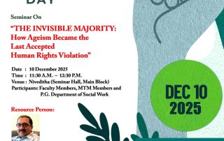 Human Rights Day 2025 Observance Seminar on 10-12-2025 P.G. Department of Social Work Naipunnya Institute of Management and Information Technology, Koratty cordially invites you all to the observance of WORLD HUMAN RIGHTS DAY 2025 Seminar On “THE INVISIBLE MAJORITY: How Ageism Became the Last Accepted Human Rights Violation” Date: 10 December 2025 Time: 11:30 A.M – 12:30 P.M Venue: Niveditha (Seminar Hall, Main Block) Participants Faculty Members, MTM Members, and P.G. Department of Social Work Resource Person Dr. Praveen G. Pai Geriatrician & Gerontologist Public Health Specialist Focal Point, WHO GNAFCC Founder & Chairman, MAGICS (NGO) Certified in Medical Law and Bioethics