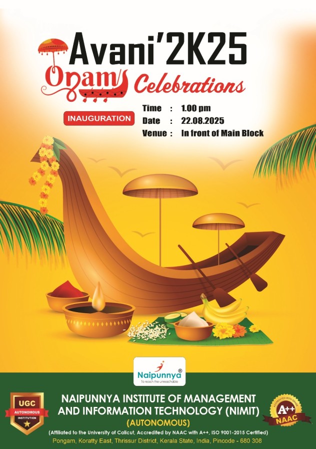 Venue: In front of Main BlockThe event will be inaugurated with festive cheer and will showcase the vibrant traditions of Kerala – cultural performances, music, and the true spirit of Onam.