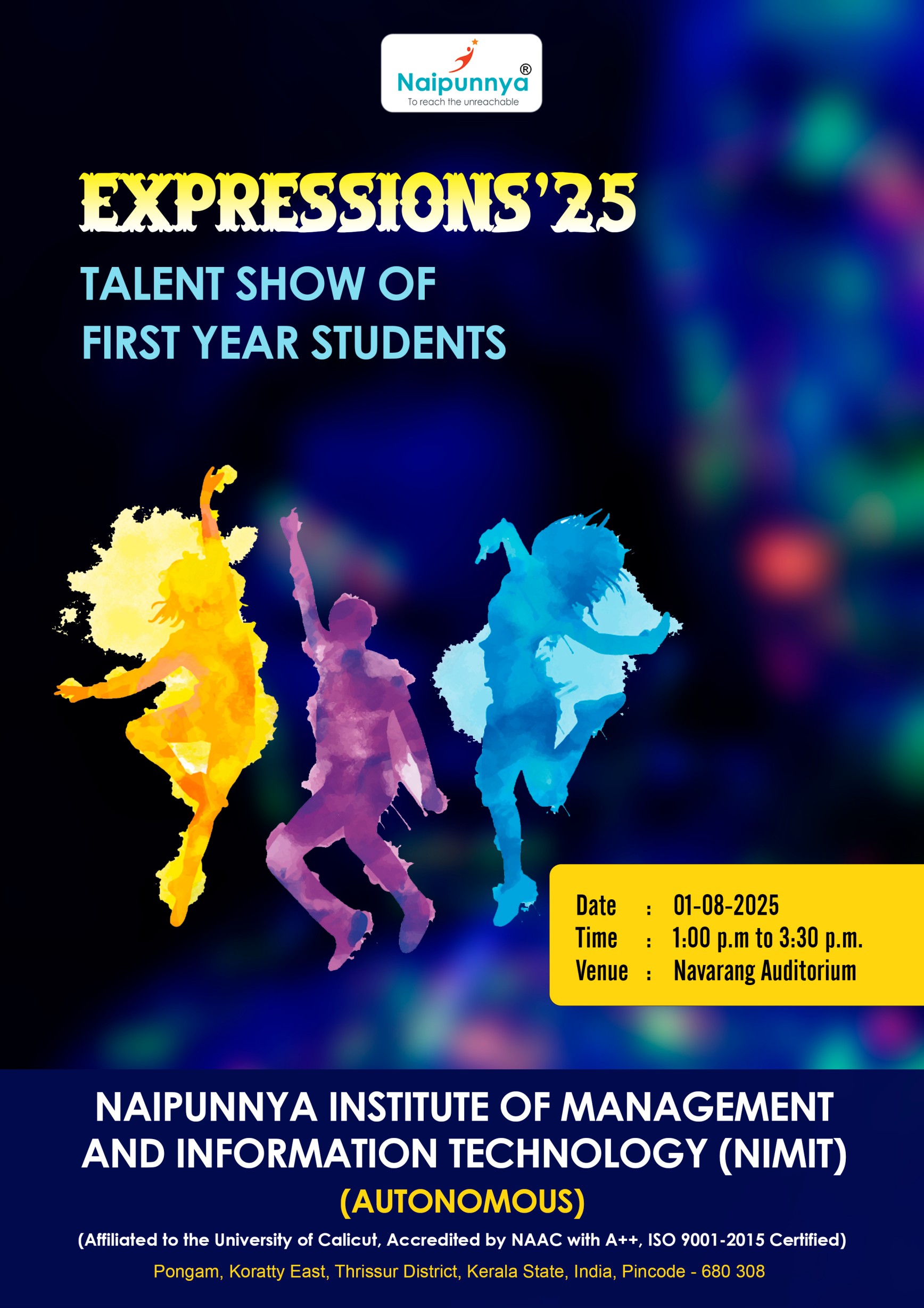We are thrilled to announce that EXPRESSIONS 2025 , the talent show of first-year students will be conducted on 1/08/2025 from 1:00 pm at Navarang auditorium. This event promises to be an exciting celebration of creativity, enthusiasm, and the spirit of our new students as they take their first steps into our vibrant college community. We warmly invite you all to join us as honored guests for this delightful occasion. Your presence and support would mean the world to our new students and will undoubtedly encourage them to shine even brighter on stage.