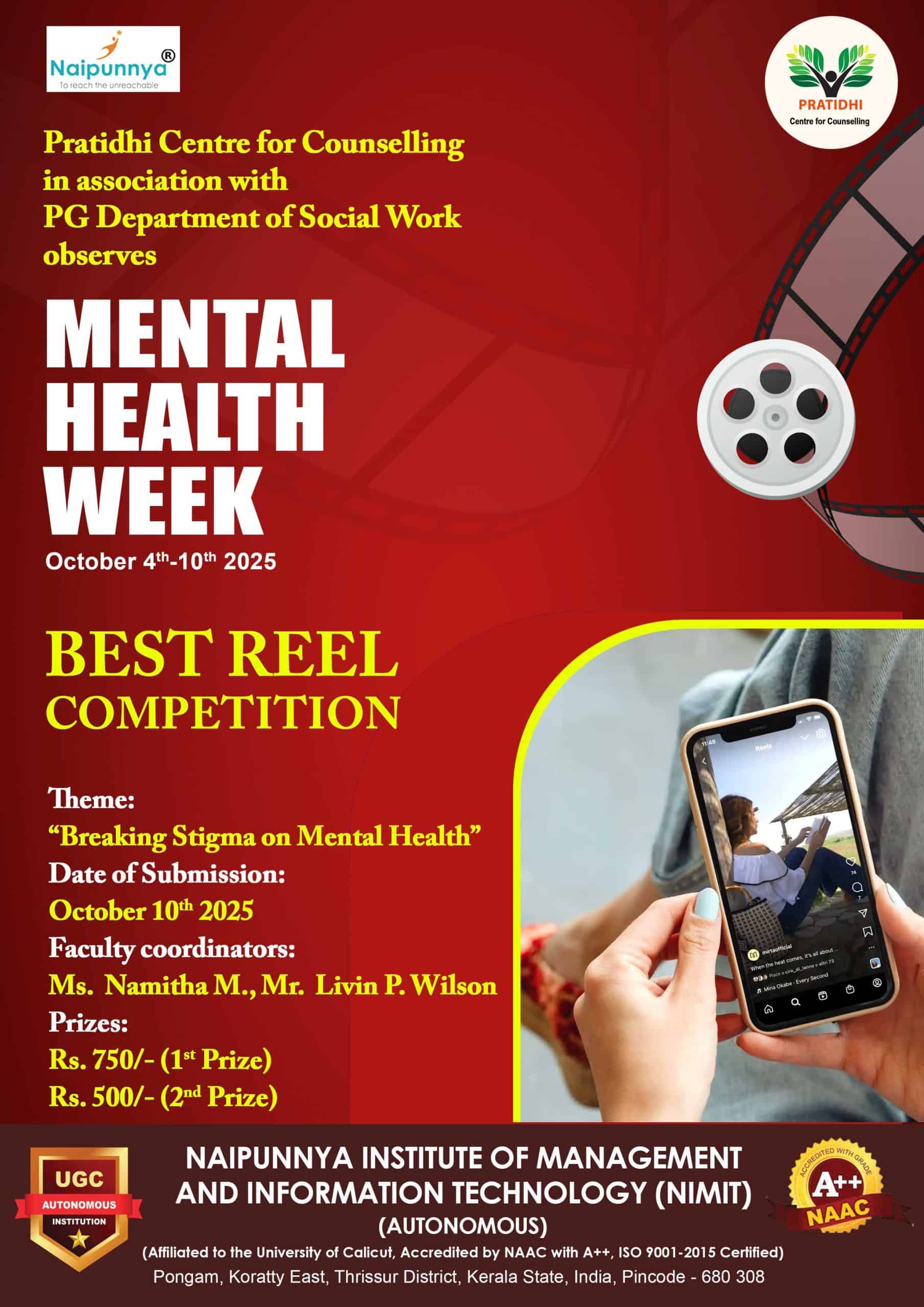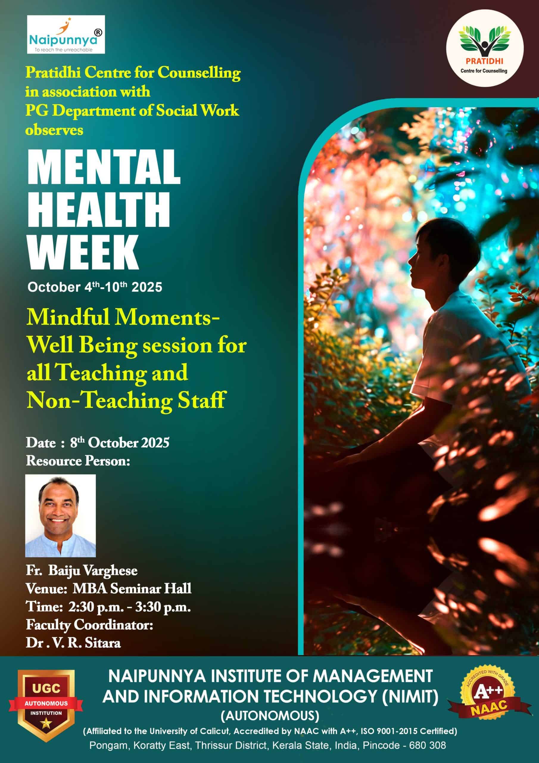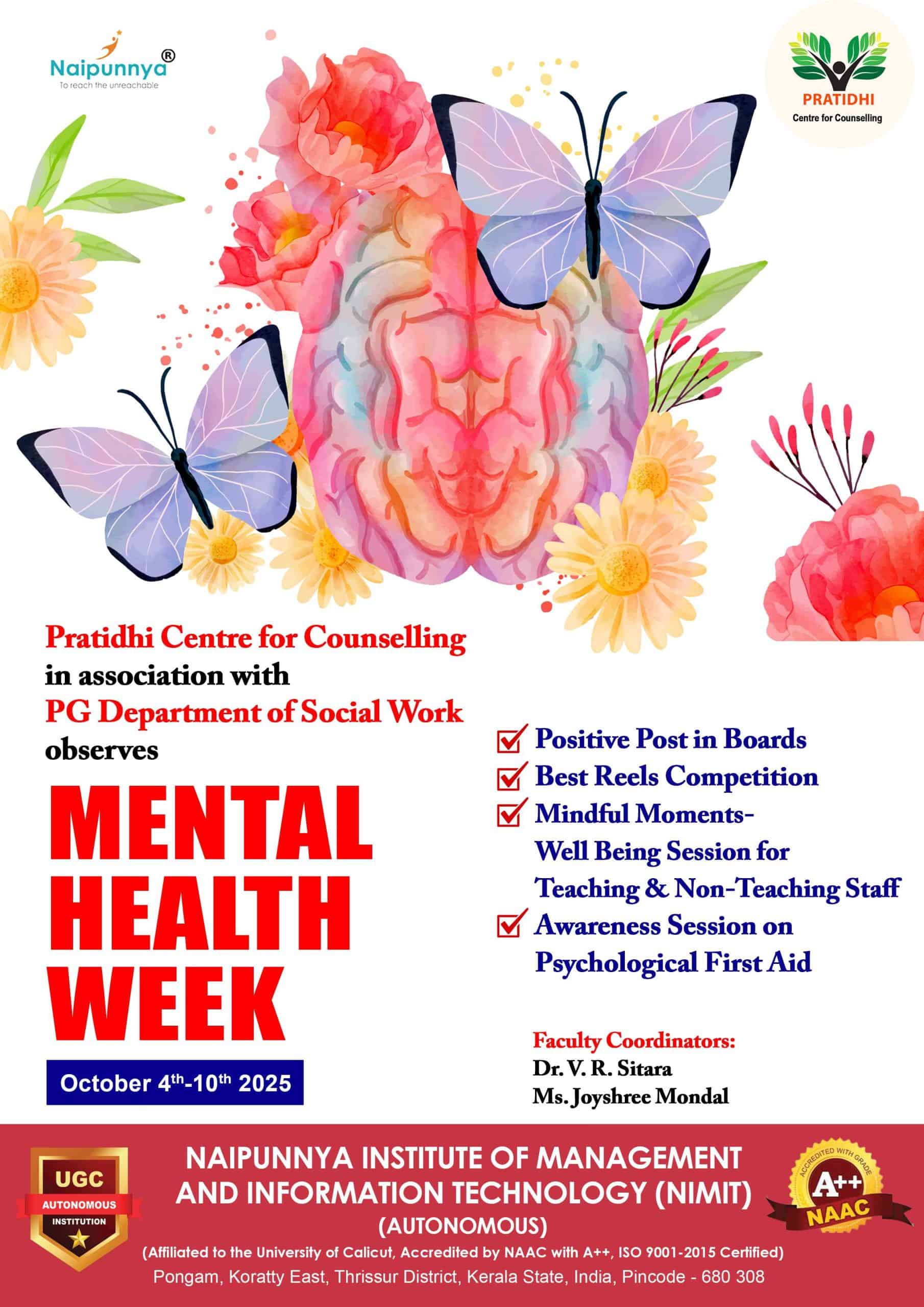 Pratidhi, the Centre for Counselling in association with the PG Department of Social Work, is observing Mental Health Week from October 4th to 10th, 2025 at the Pongam campus.