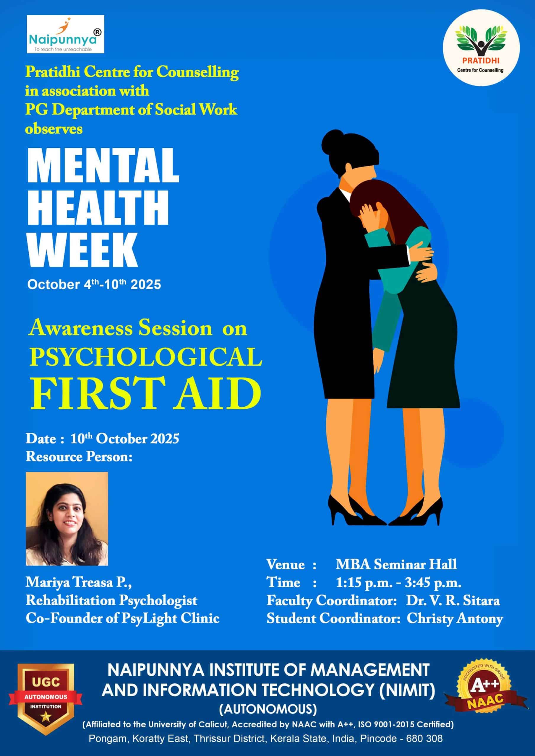 As part of Mental Health Week 2025, Pratidhi Centre for Counselling in association with PG Dept of social Work presents an Expert Session on Psychological First Aid by Ms. Mariya Treasa, Rehabilitation Psychologist and Co Founder of PsyLight Clinic.